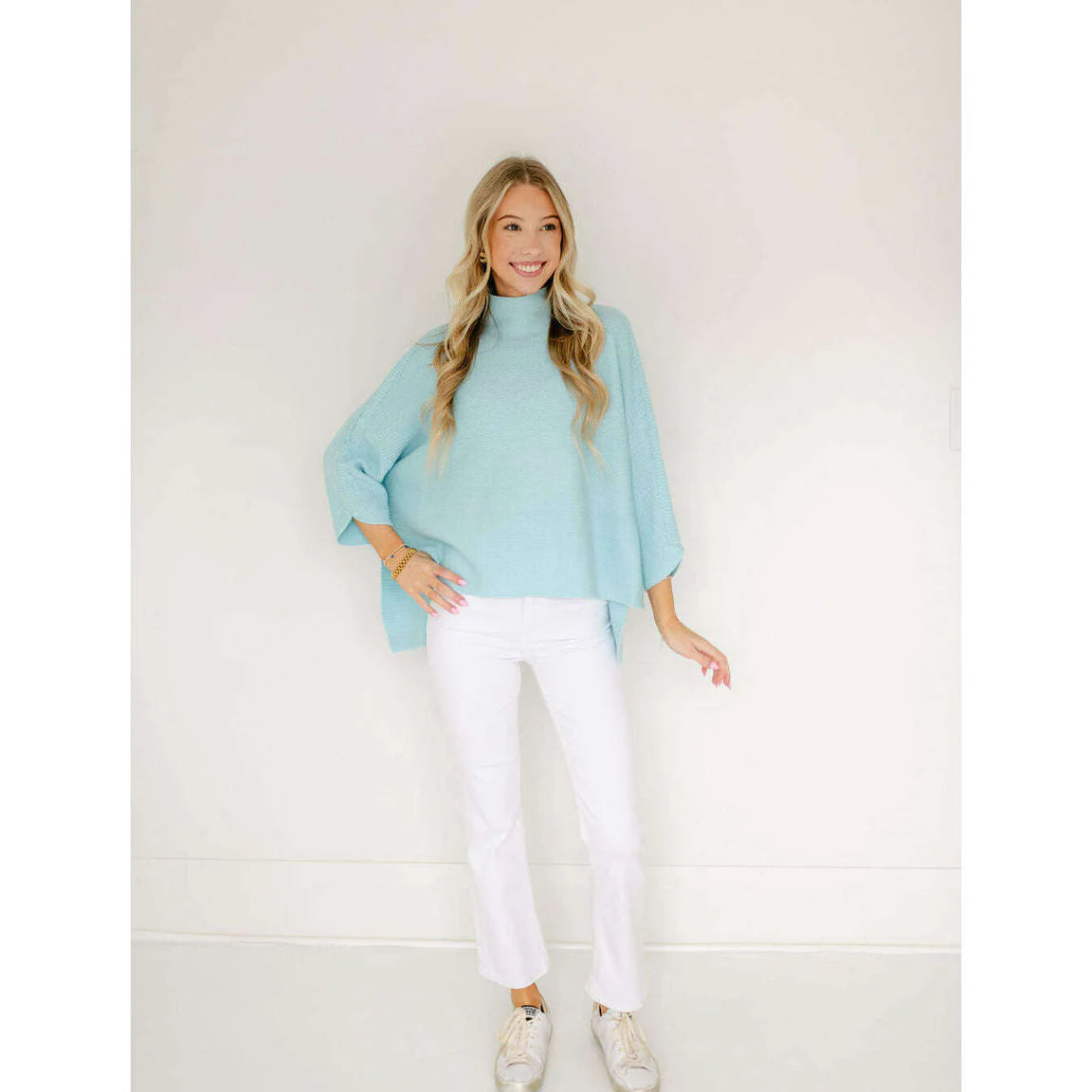 Indulge in feminine energy with this luxurious oversized turtleneck sweater. Softly rounded cuffs, a sculptural neckline, and a charming hemline perfectly complement elegant style. Features 3/4 sleeves, contrasting rib accents, and side slits by Kerisma. Pair with a dress or skirt for a effortlessly chic look.