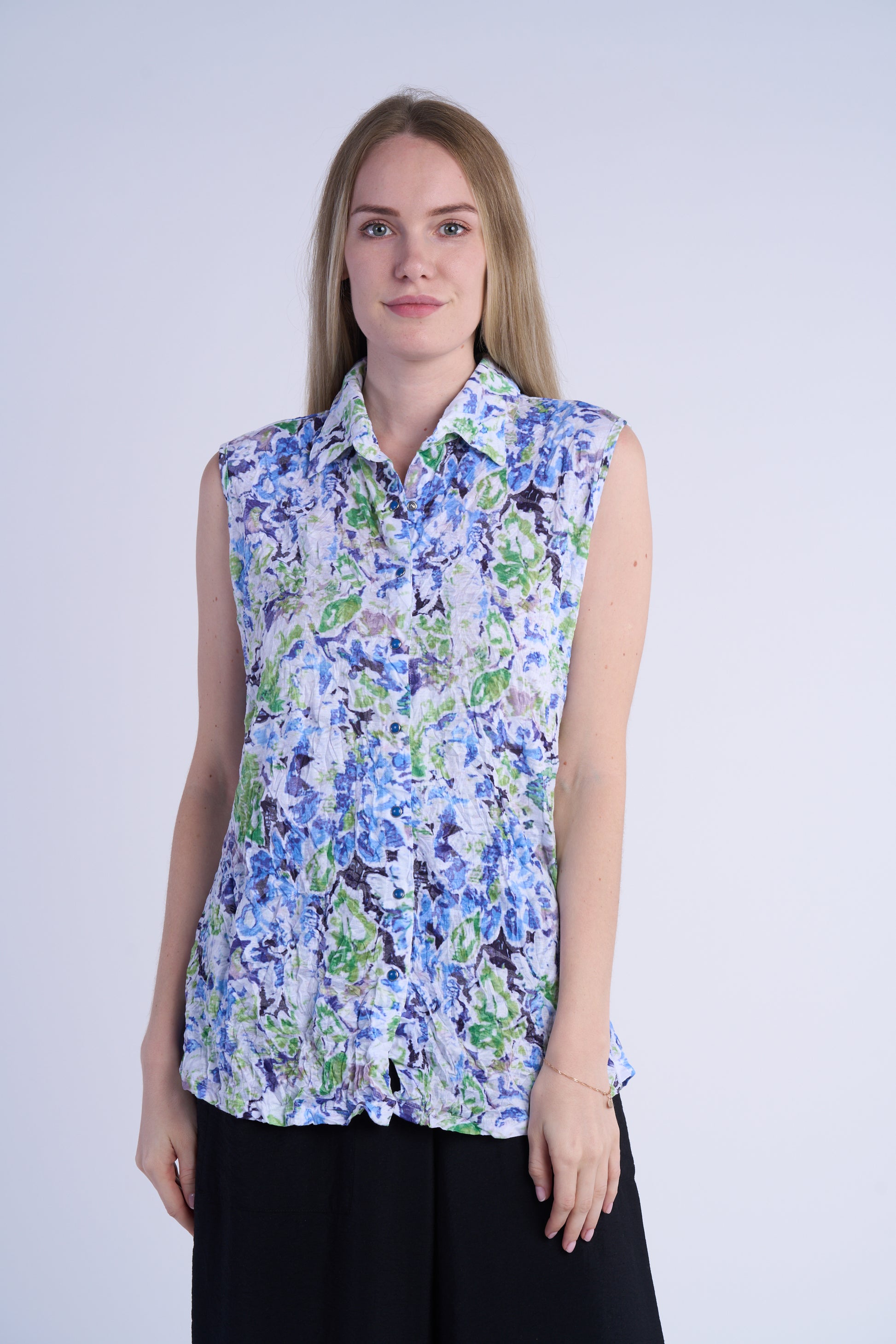 This sleeveless crinkle tank top from Shana Apparel offers a soft, breathable fabric that keeps you cool and comfortable throughout the day. Its textured design adds subtle visual interest while maintaining a lightweight feel, making it an ideal choice for warm weather or layering under jackets and cardigans. Crafted for both style and ease, this blouse combines effortless elegance with practical comfort.