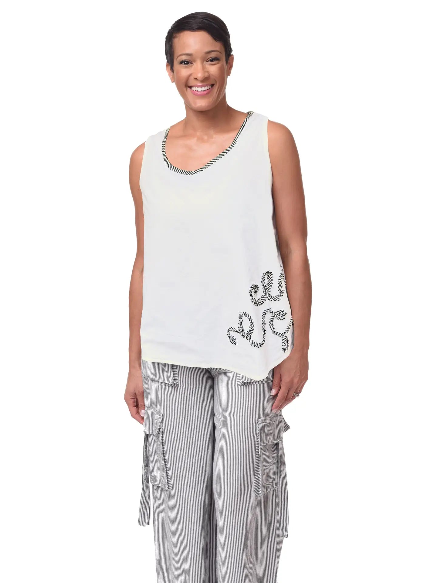 The Eileen Tank features lightweight white cotton voile, offering breathable comfort ideal for warm weather. Its sleeveless design ensures ease of movement, while the playful stripe applique adds a refined, contemporary detail. This tank combines simplicity with subtle sophistication, making it a versatile piece for layering or wearing alone.