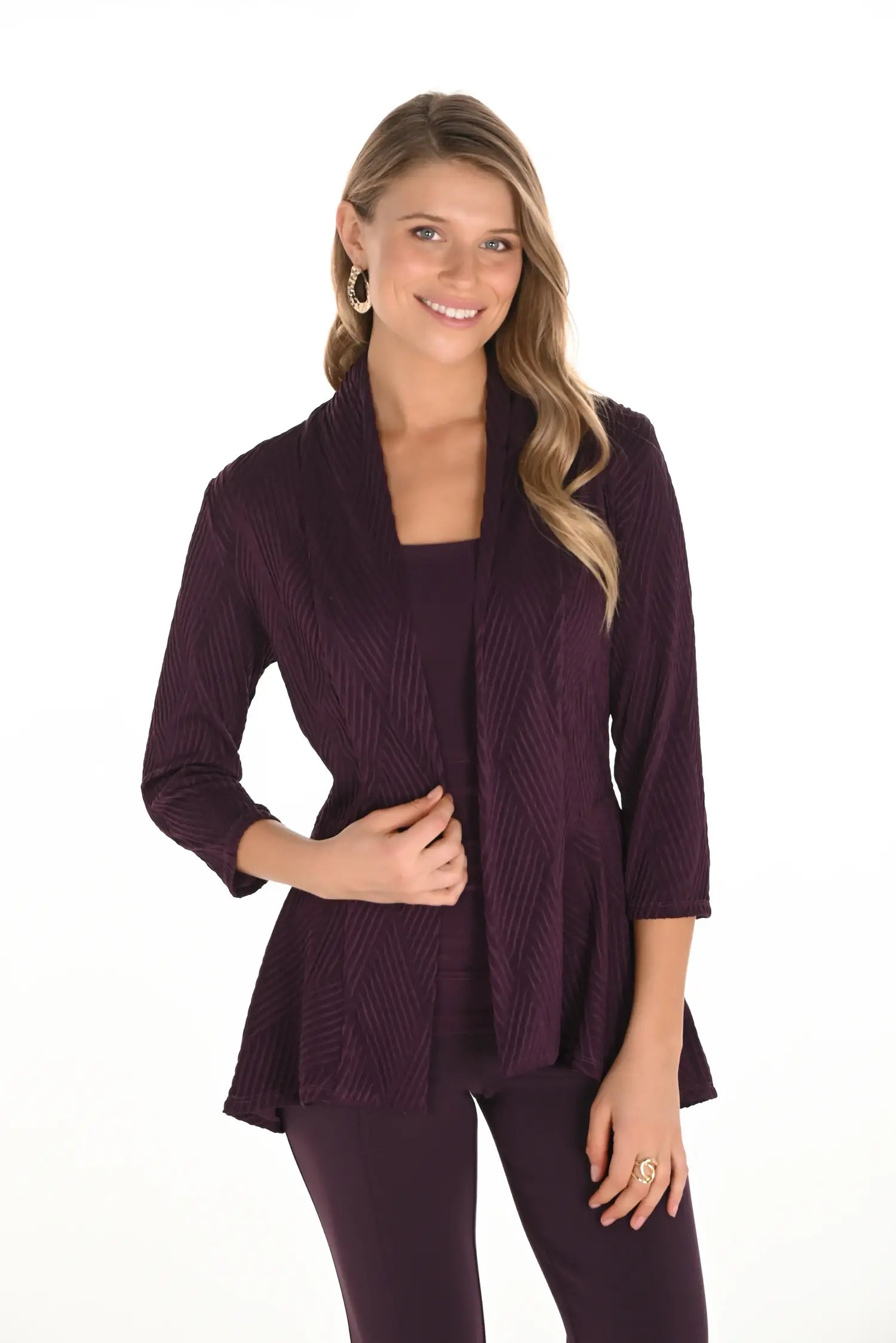 Made in Canada, this elegant throw over from Frank Lyman features a distinctive argyle-inspired textured ribbed knit that elevates any outfit. Its open front design allows for effortless layering, while the 3/4 sleeves provide adaptable wear across seasons. The fit-and-flare silhouette enhances your shape with a refined, feminine appeal, making it a versatile and polished addition to your wardrobe.