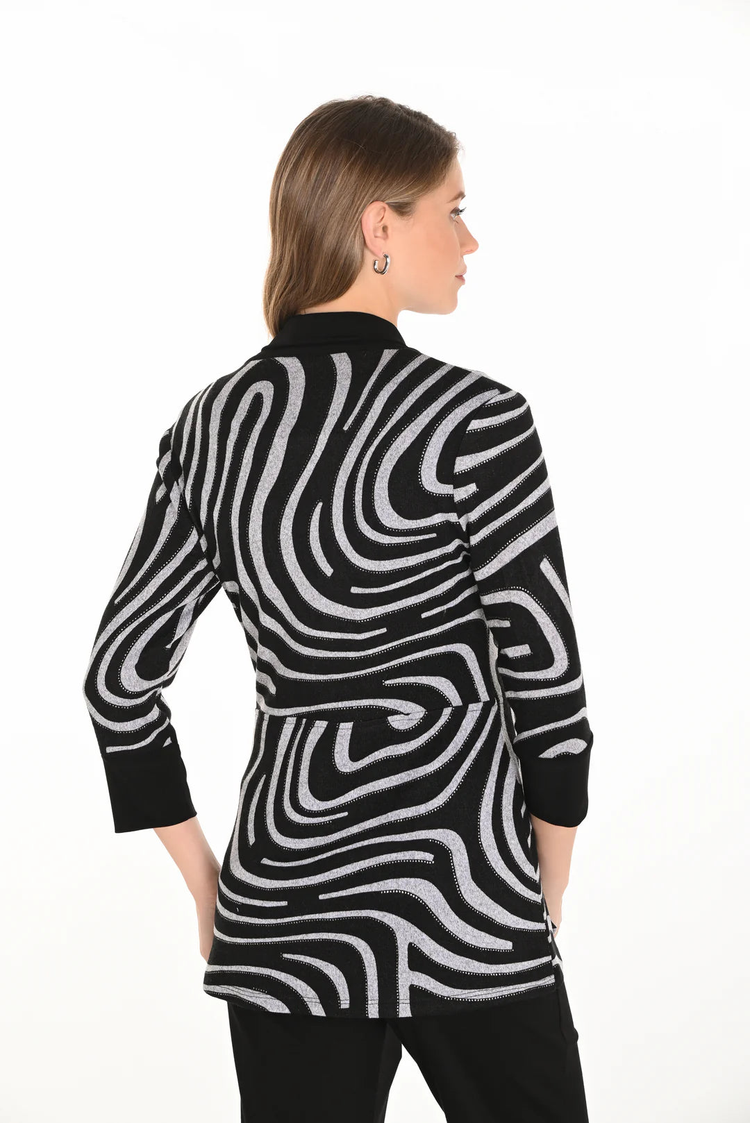 This open-front knit cardigan by Frank Lyman features a sophisticated grey and black print, combining style with comfort. Its lightweight knit fabric makes it an ideal layering piece for transitional weather, offering warmth without bulk. Designed for versatility, it effortlessly complements both casual and dressier outfits, enhancing your wardrobe with a refined, expert touch. Sleeveless top sold separately.