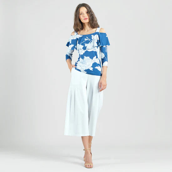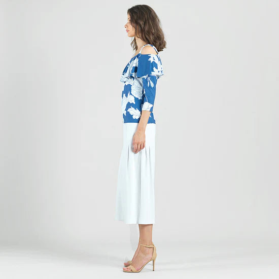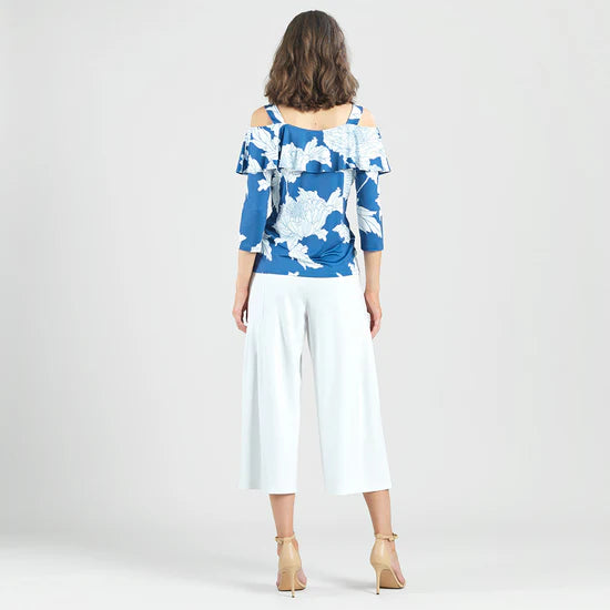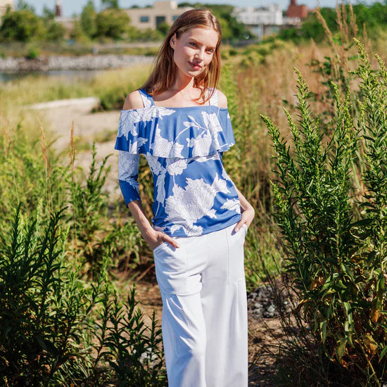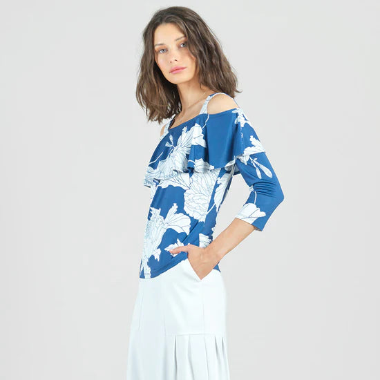 Experience timeless beauty with our Mum Print Flounce Top from Clara Sunwoo. Made from a wrinkle-free, elegant, translucent fabric, it features a cold open shoulder, ruffled sweetheart neckline, and 3/4 length sleeves. The soft, velvety-silken-like finish is cool and smooth to the touch. Travel-friendly with a breathable jersey-like feel. Upgrade your wardrobe today.