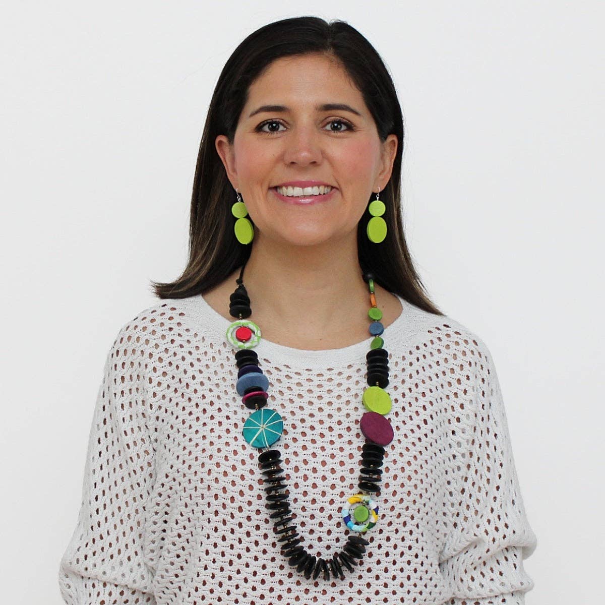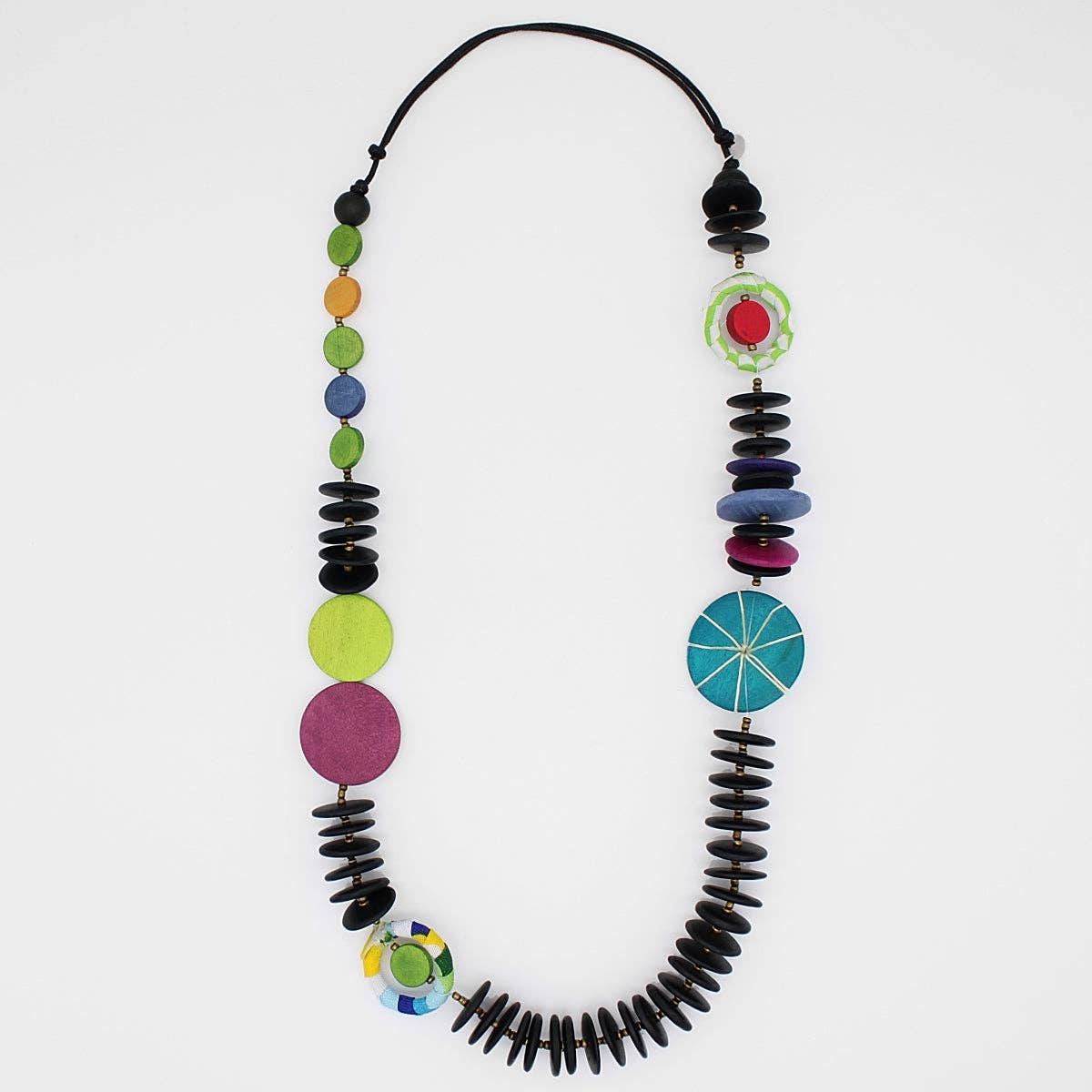 A show-stopping accessory that will instantly elevate your look! This multi color necklace boasts a unique design, carefully handcrafted to capture attention from every angle. The combination of vibrant wood beads and the contrasting accents of thread and fabric, create a striking and harmonious effect in a lightweight design. Hung on an adjustable black wax cord, you get to choose the length you prefer. Adjustable Length: 30"-36"